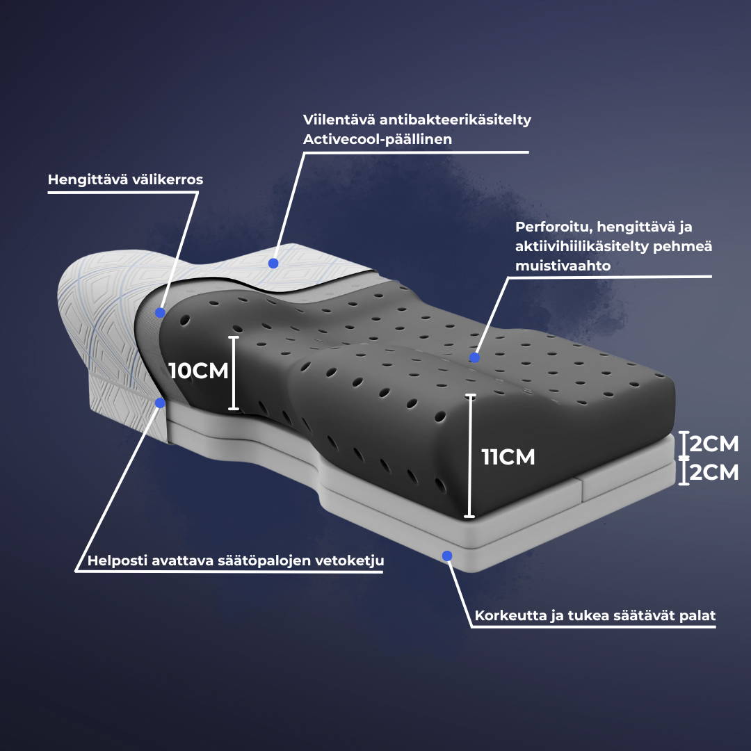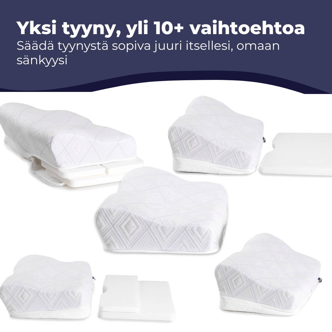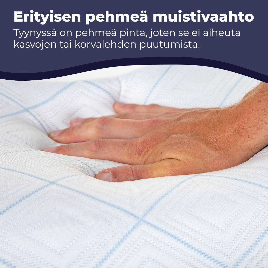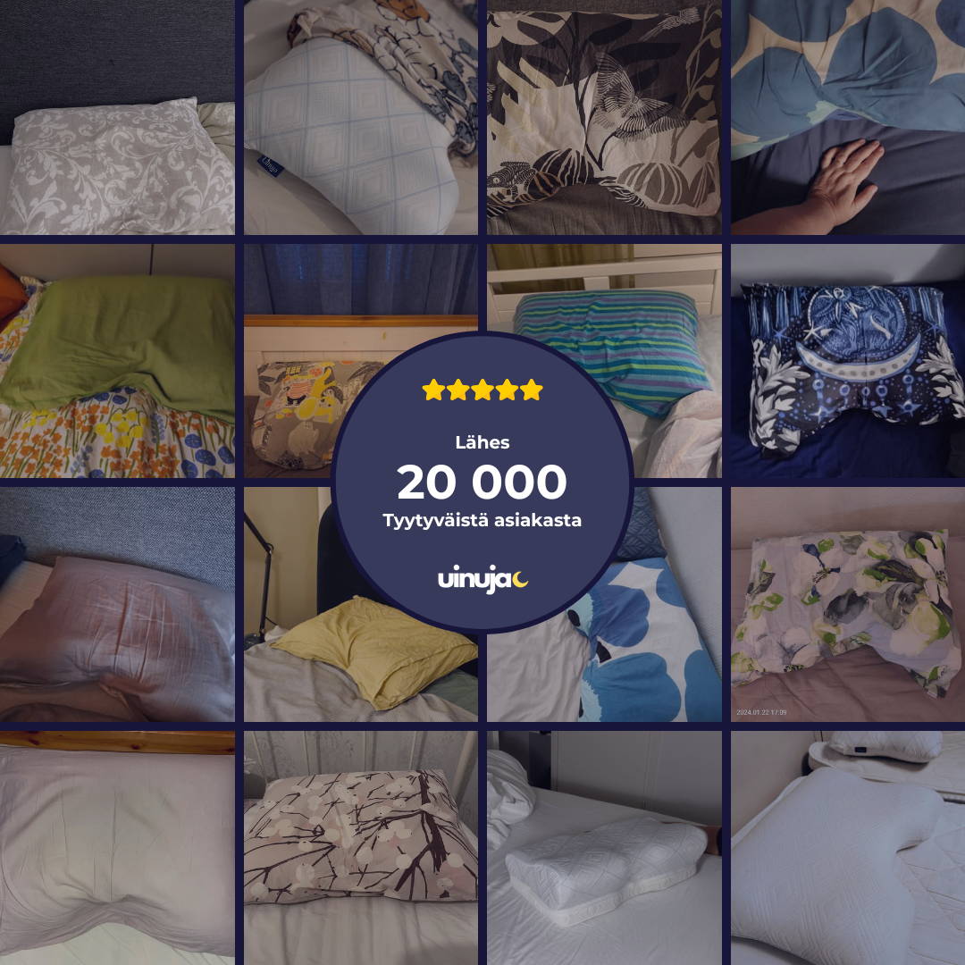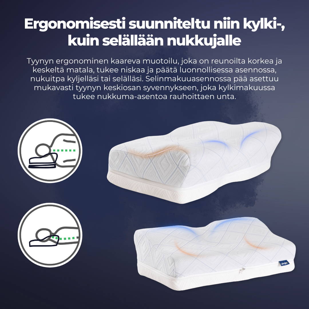 Edellä mainittujen ergonomisten ominaisuuksien lisäksi muistivaahdosta valmistettu Uinuja-tyyny myös vähentää tarvetta liikkua, mikä auttaa parantamaan unenlaatua ja näin ollen auttaa sinua myös pysymään unessa pidempään.
