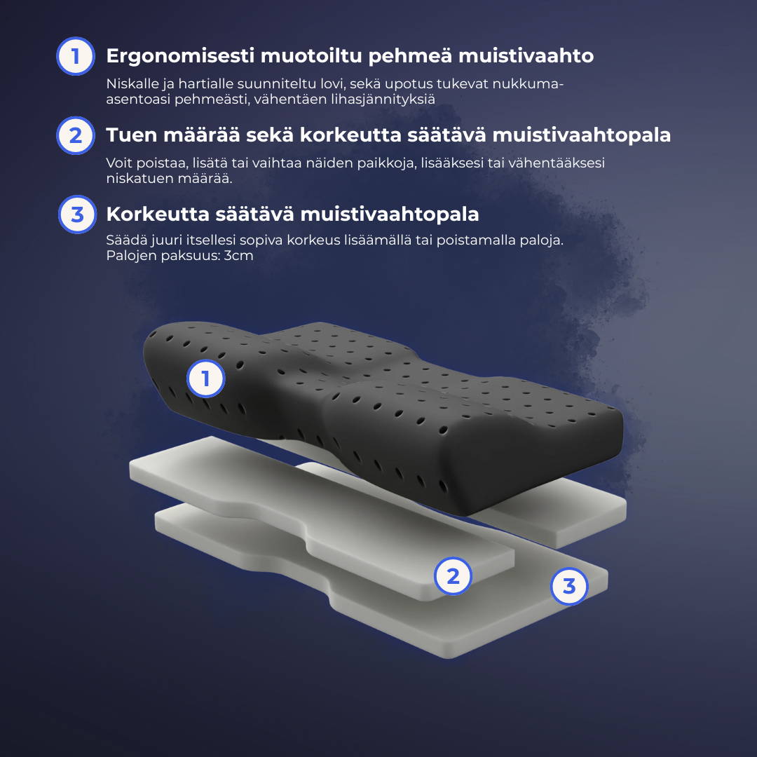 Uinuja-tyynyt muovautuvat kehon lämmön ja paineen avulla yksilöllisten muotojesi mukaisesti, mikä jakaa painon tasaisesti ja vähentää painepisteitä. Tämä auttaa lihaksia rentoutumaan ja parantaa verenkiertoa, mikä voi auttaa kivunlievityksessä.